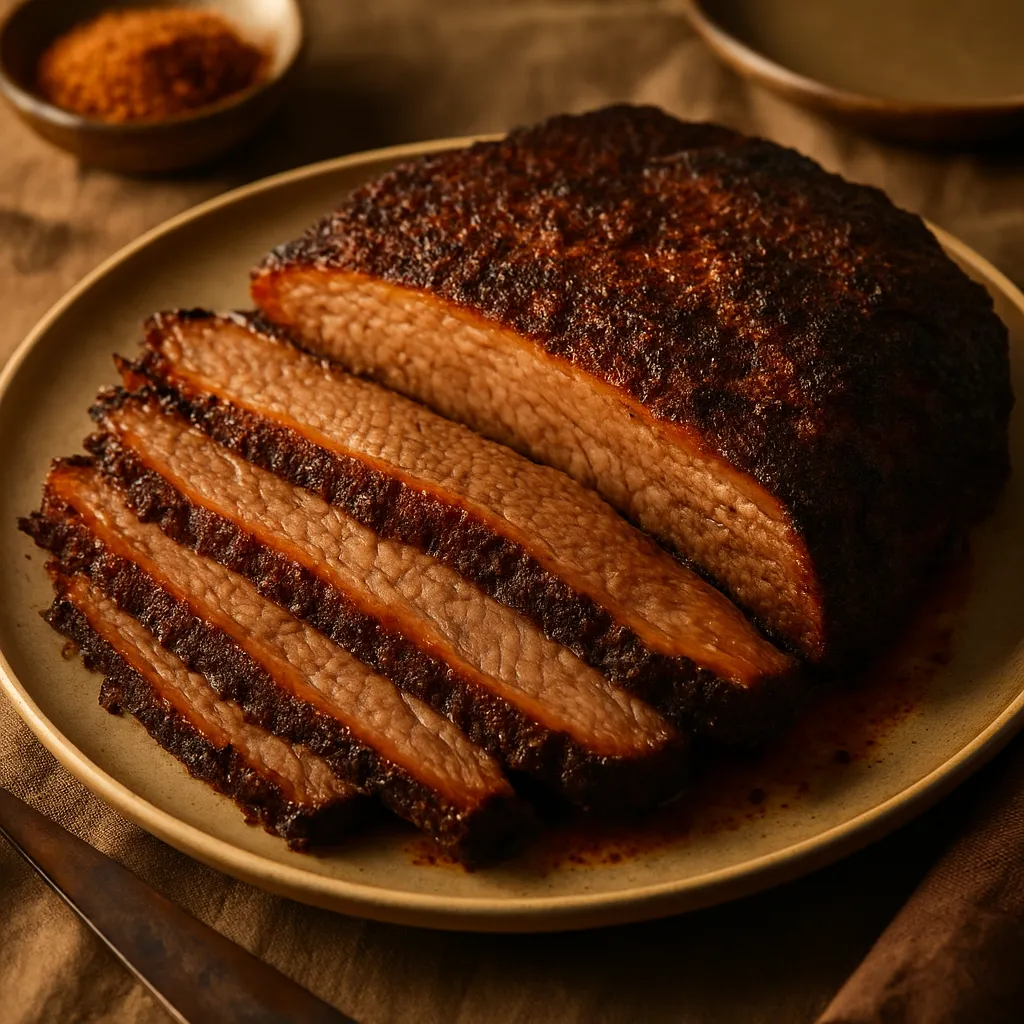 A classic Texas-style smoked brisket seasoned with a robust dry rub, slow-cooked for tender, smoky perfection.