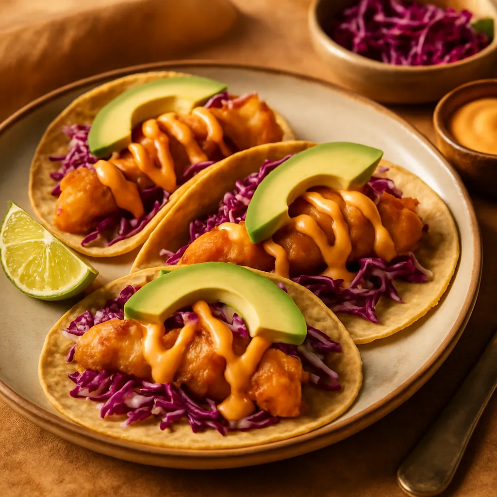 Assemble the tacos: Place 2-3 pieces of crispy fish on each tortilla, top with the marinated cabbage slaw, a drizzle of chipotle sauce, and slices of avocado.