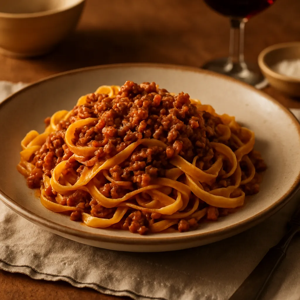 A hearty Bolognese sauce made with minced beef, pork, and vegetables, served over fresh tagliatelle pasta.