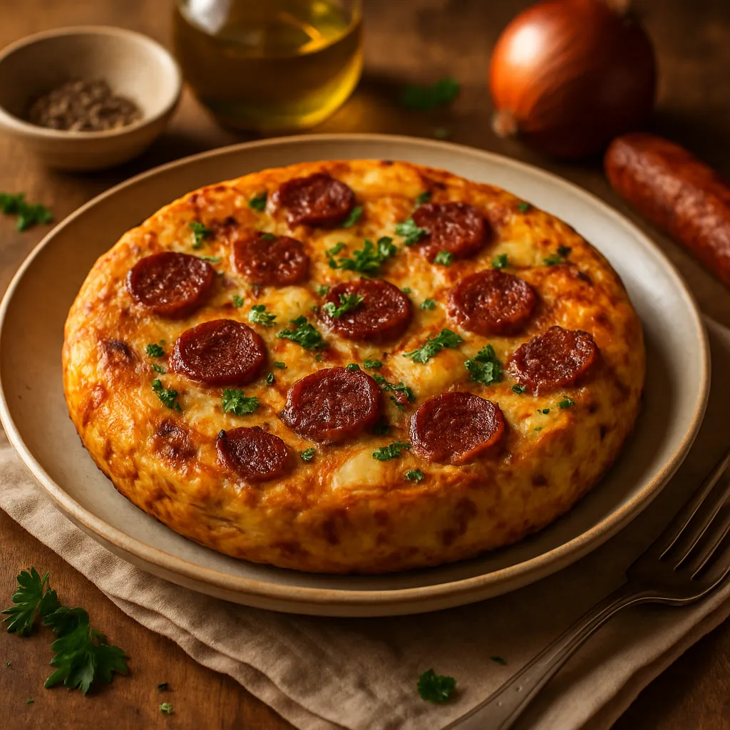 A Spanish omelet combining potatoes and chorizo, offering a delicious twist on a classic dish.