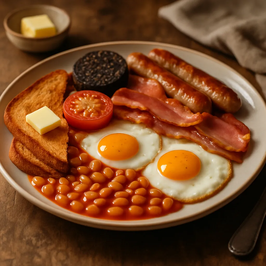 A hearty mix of eggs, sausages, bacon, black pudding, and baked beans, served with toast.