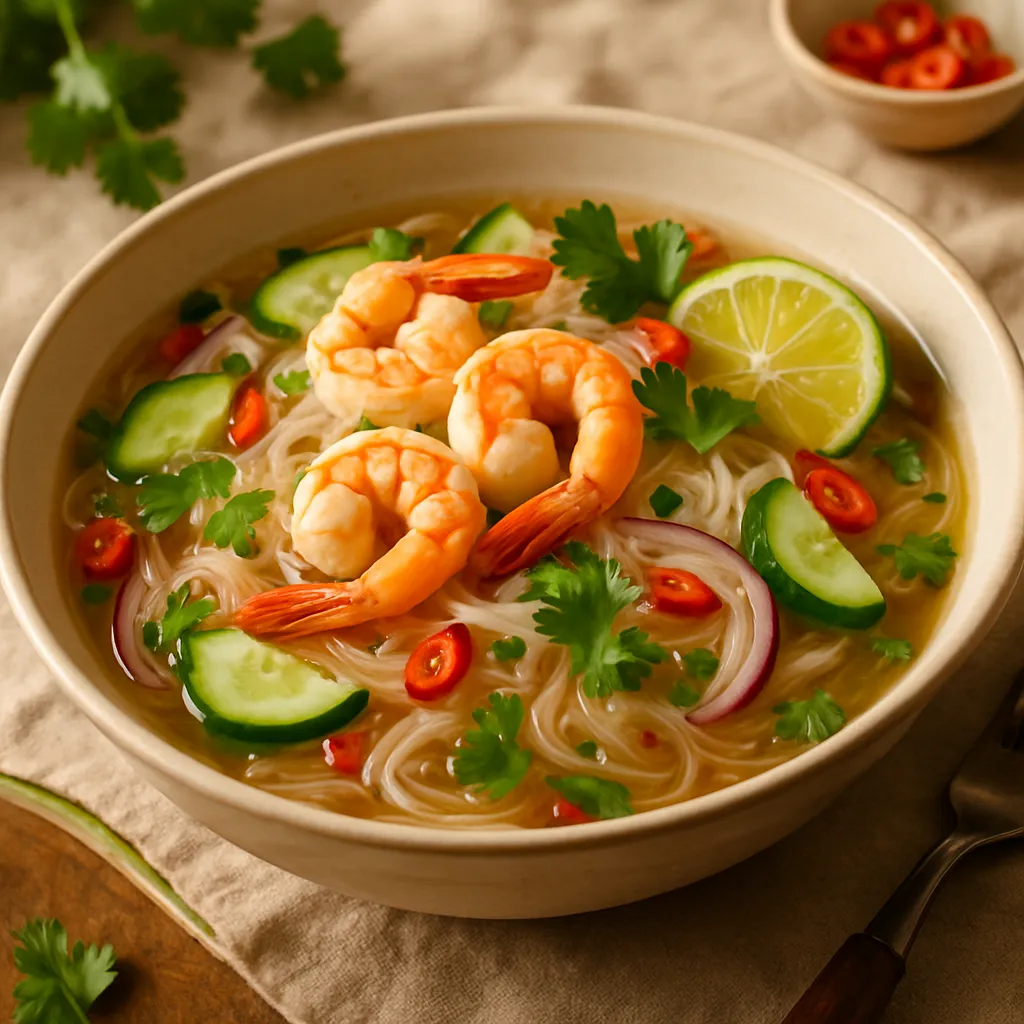 A refreshing soup salad with glass noodles, shrimp, and a spicy lime dressing, perfect for a light meal.